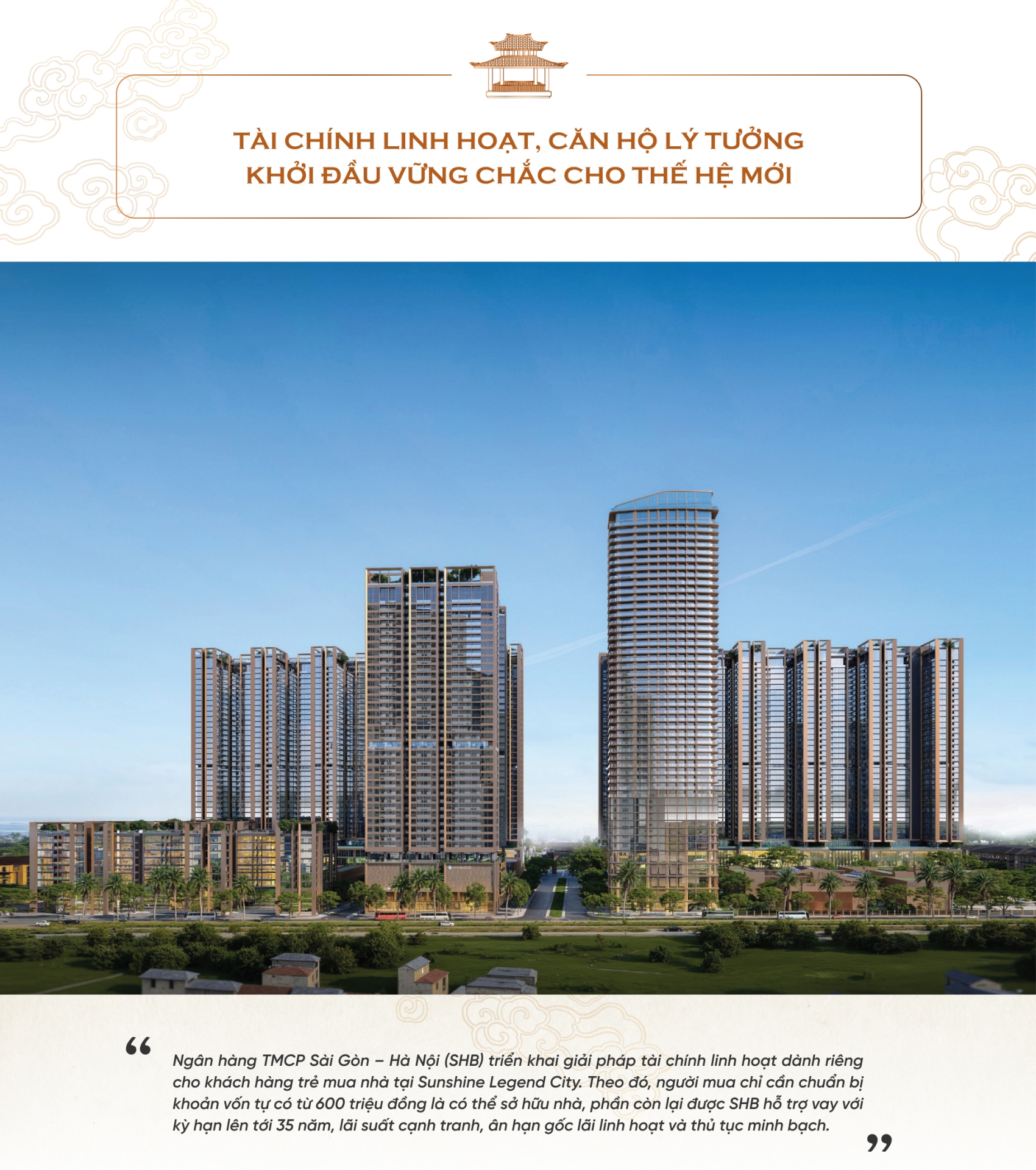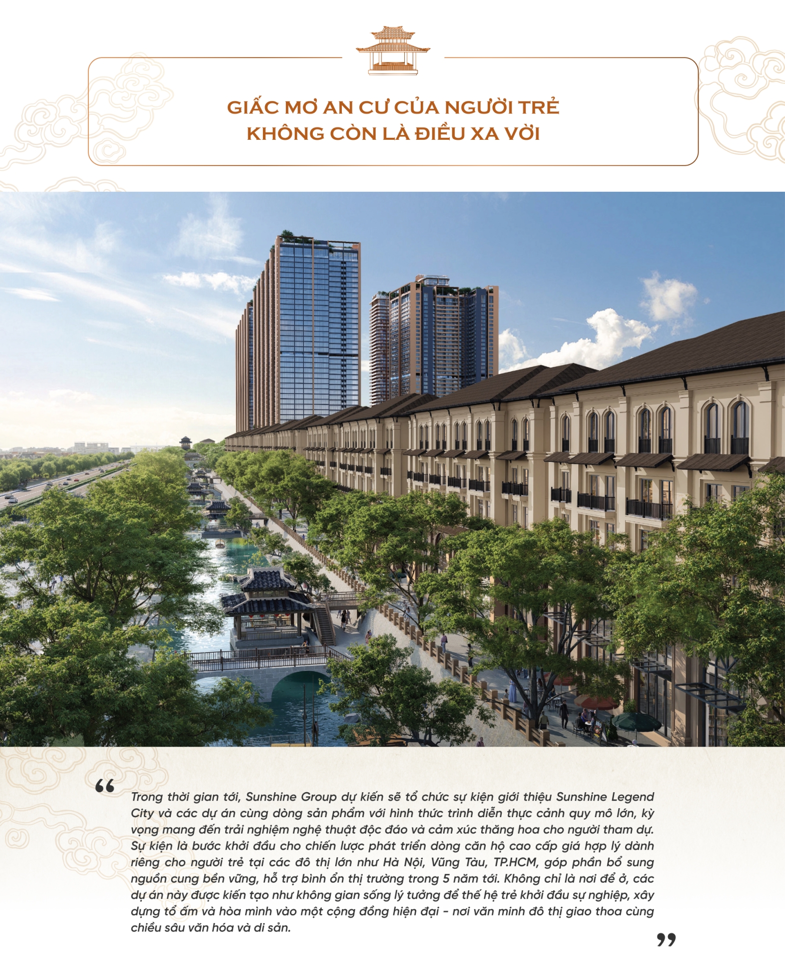 Dẫn đầu cho dòng sản phẩm mới này là dự án Sunshine Legend City toạ lạc tại phía Đông Thủ đô, với cảm hứng từ di sản Phố Hiến vang bóng một thời. Không chỉ là dự án nhà ở thông thường, Sunshine Legend City còn mang trong mình sứ mệnh kế thừa và phát huy chiều sâu văn hoá của một vùng đất giàu truyền thống, nơi từng là một trong những thương cảng phồn hoa bậc nhất Việt Nam.